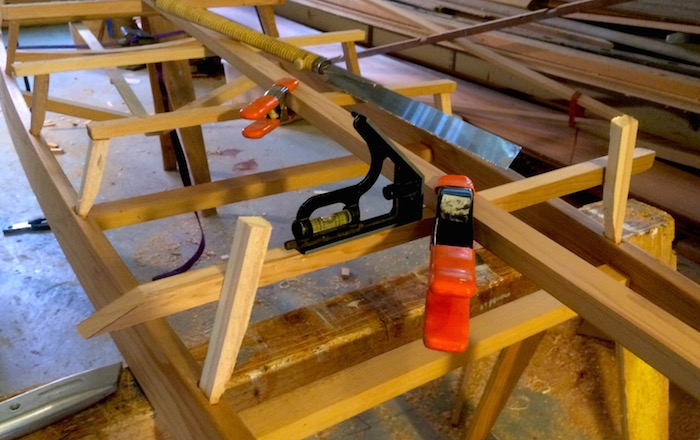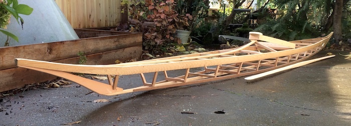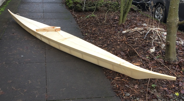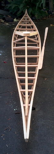 Before the 1950s, Inuhuit kayaks typically had pieced ribs instead of bent ribs; as can be seen, the cockpits were also formed from a number of straight pieces instead of a bent hoop. The above photo shows a step in the process of making these ribs: The vertical pieces are tenoned into the gunwales, and the floor-piece is clamped in place in order to mark where the vertical pieces should be trimmed. Behind this you can see ribs that have their floor-piece nailed in place, but haven't been trimmed to length yet. While this kayak is almost entirely nailed together, earlier Inuhuit kayaks had all of these joints lashed together. Arund the 1950s the Inuhuit began to use bent-ribs in their kayaks, modelled after more southerly Greenland kayaks.