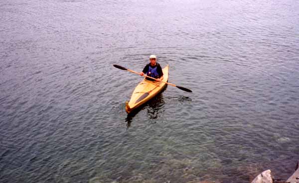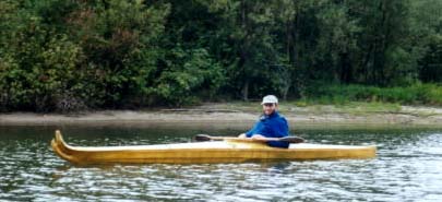 This image shows the kayak being paddled on one's knees, with a single bladed paddle.