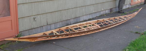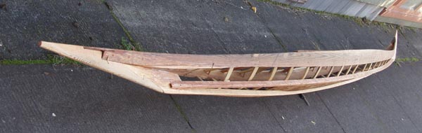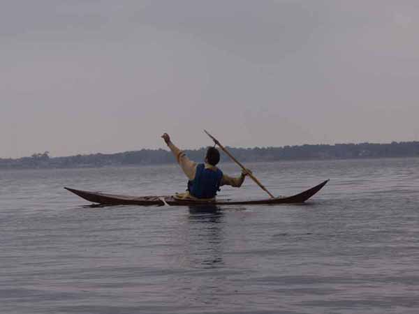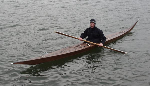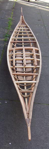 This older-form high sterned East Greenland kayak was replicated from a survey I made in 2002. This kayak's lines also appear in John Brand's "The Little Kayak Book" Volume III (1988:85). This kayak measures 18'4-3/8" long, and 20-5/8" wide. It was launched in June of 2004. (A second replica of this kayak was finished in October, 2005). A scale drawing of this kayak appears in Kayaks of Greenland.