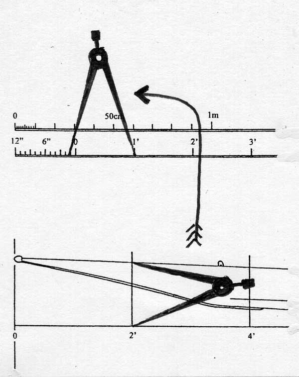 Once all the desired stations are drawn, offsets can then be taken with a pair of dividers. For example, the height of the sheer above the baseline (datum) at 2' aft of zero is found by touching the divider's points to the sheer and the baseline at the 2' station, and then transferring this span to the scale--13" is the height.
