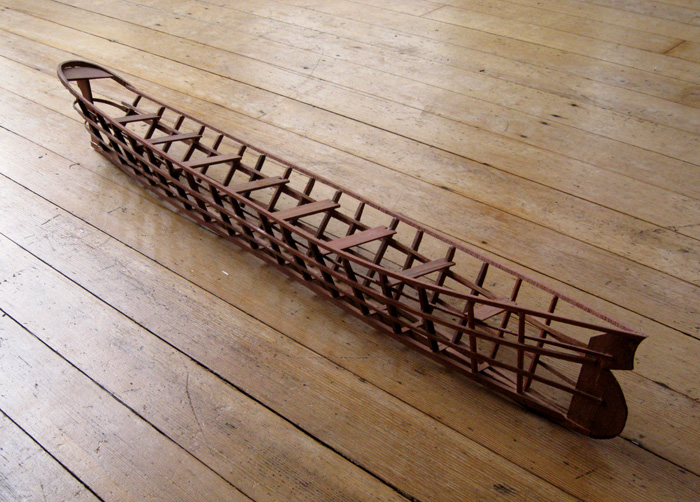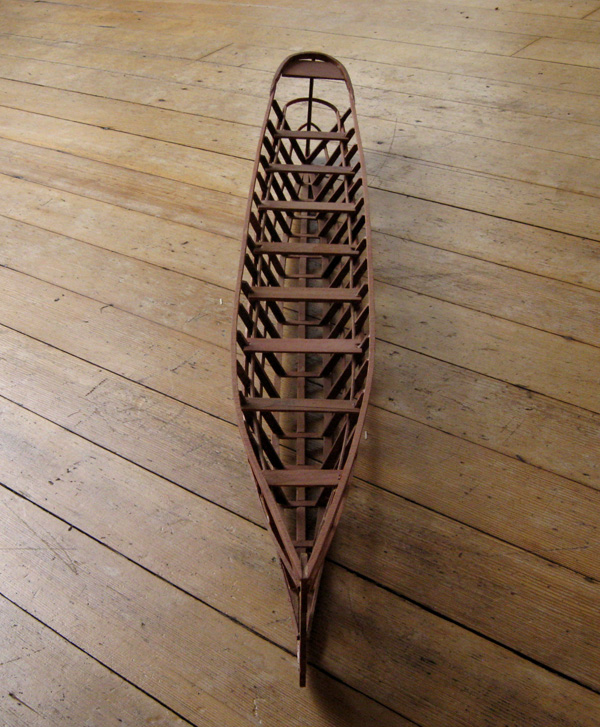 A model umiak made from Ivan Koriukin's 1805 drawing of a "Baidara from the Peninsula of Alaska" -- either Aleut/Unangan or Pacific Yupik/Sugpiaq. The model measures 37" by 4-3/4" and the orginal is just under 40 feet long and 49" wide.