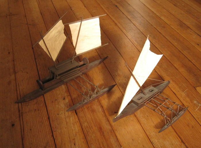 These are a few of the models I've made over the years. They aren't replicas, and they even aren't what I would consider to be particularly well-made, but they are in my eyes pretty. Where a full-size usable boat embodies hopes and dreams, models instead are limited to dreams. My inspirations are all over the place, but you might correctly suspect that A.C. Haddon & James Hornell's "Canoes of Oceania" figured prominently.